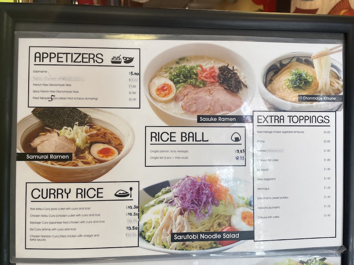 Cold Noodles feature several soba variations such as Zaru Soba, Ten Zaru Soba, and the Cold Samurai Ramen with soy-based broth, eggs, and vegetables. These dishes are suited for lighter meals or warmer weather.